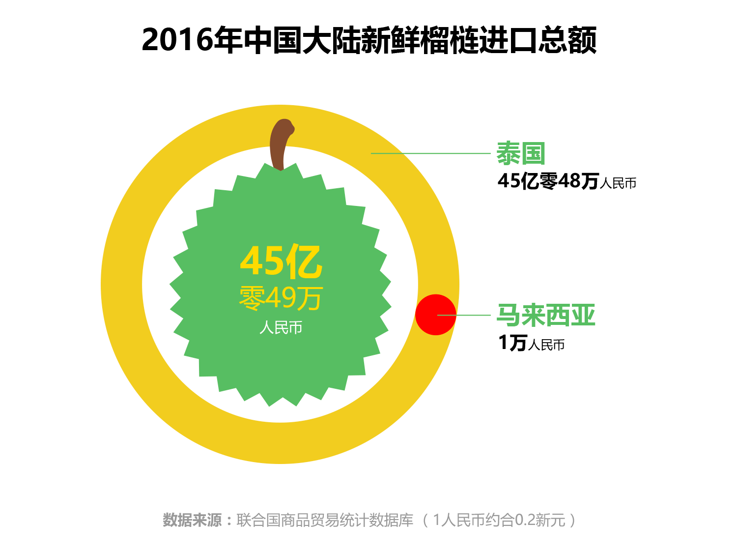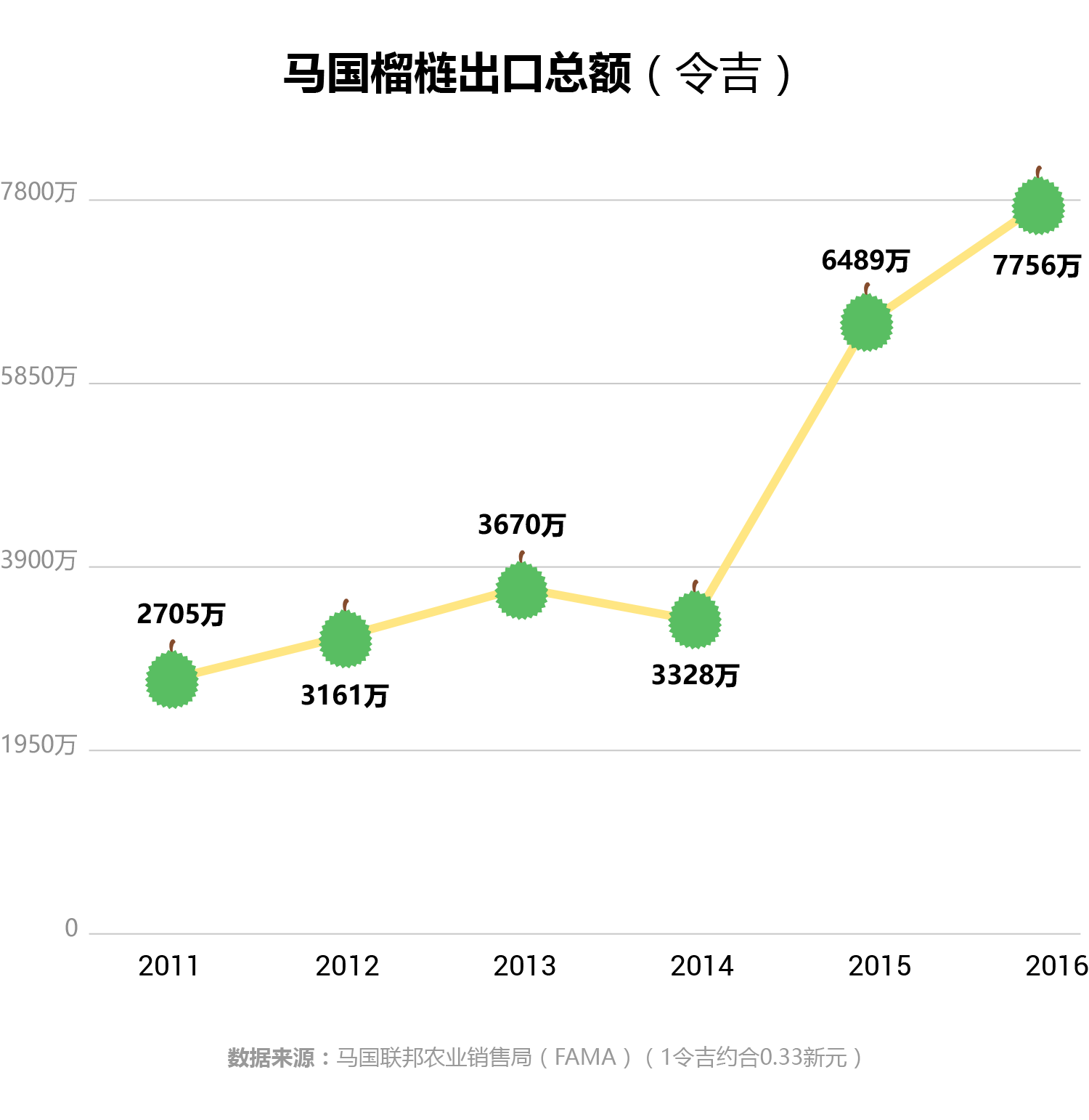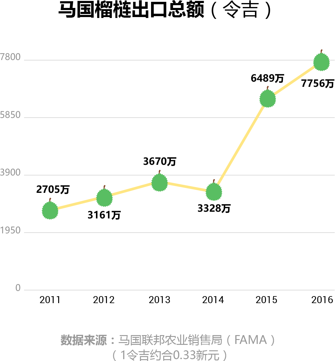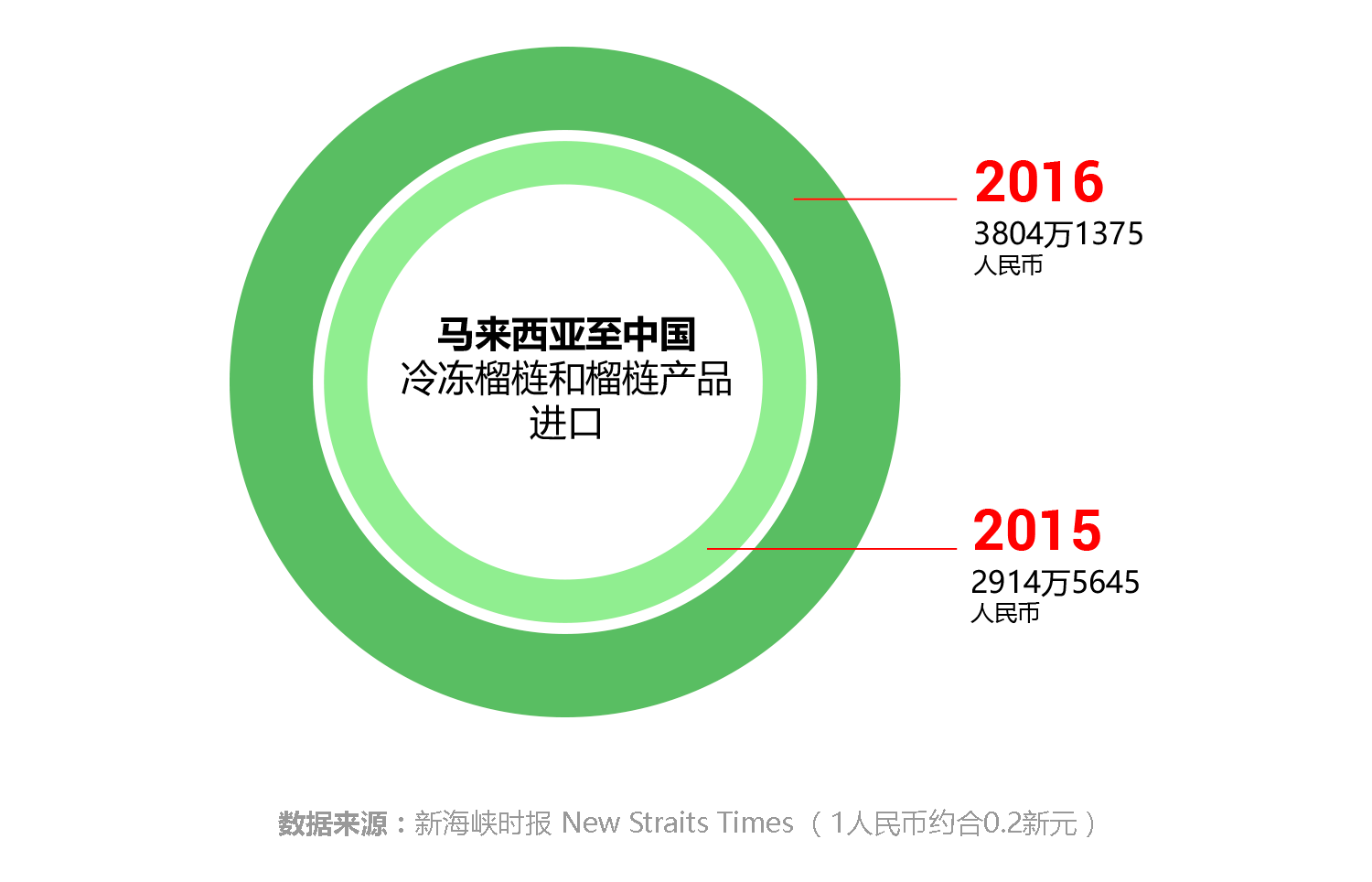 不过,马来西亚政府已看到中国市场的庞大和榴梿经济的无限可能,正努力推动榴梿鲜果出口中国。一些业者估计,中国有可能在2018年开放马国新鲜榴梿进口。