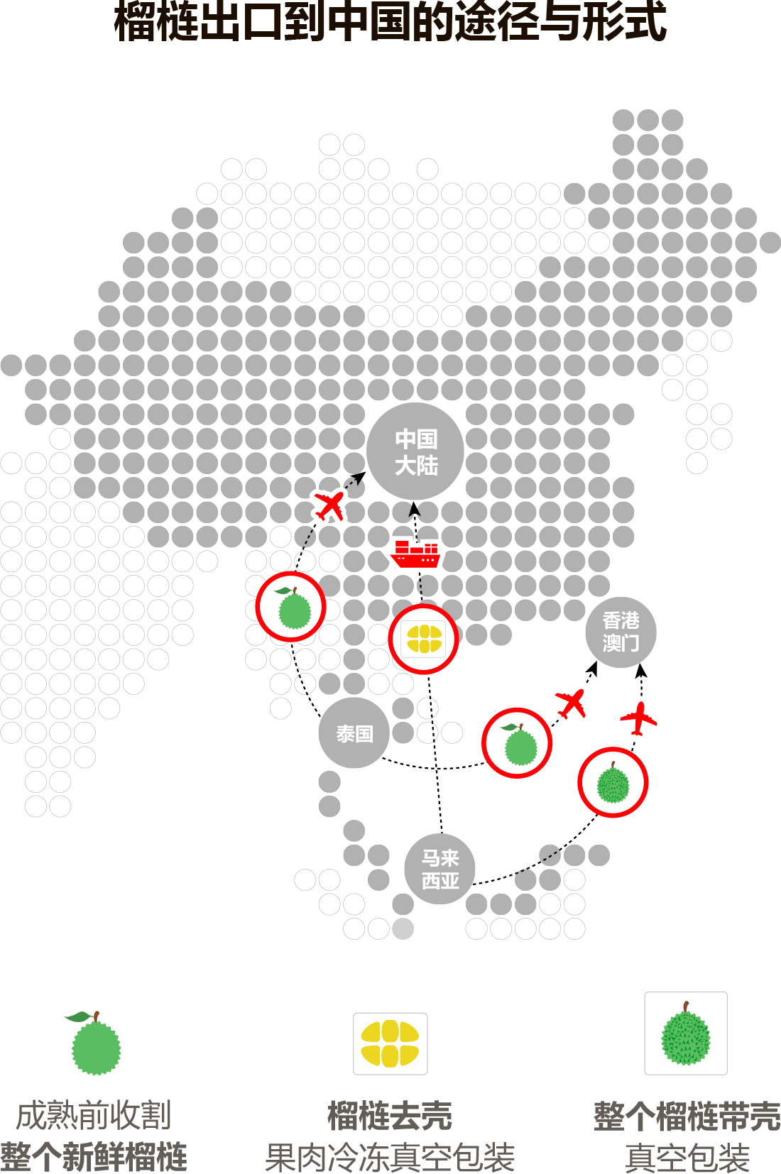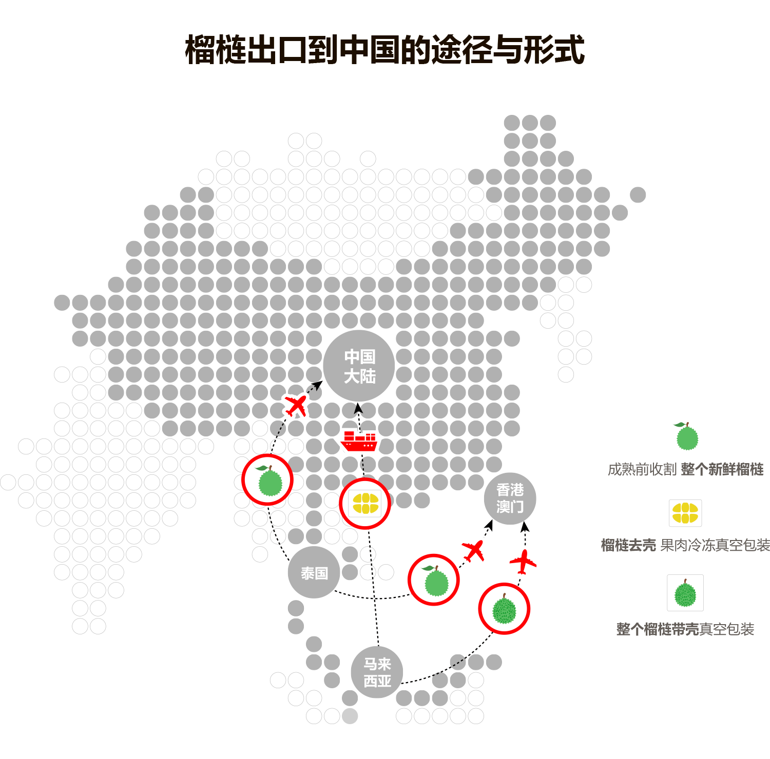相比之下,泰国榴梿可以在未成熟时便从树上收割。出口到中国虽路途遥远,但刚好供榴梿鲜果慢慢成熟。因此,中国市面上的榴梿鲜果几乎由泰国品种垄断,马国榴梿只能在冷冻鲜果和榴梿口味产品市场中分得一杯羹。