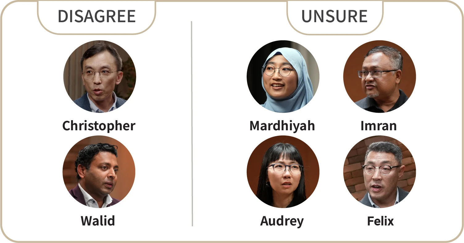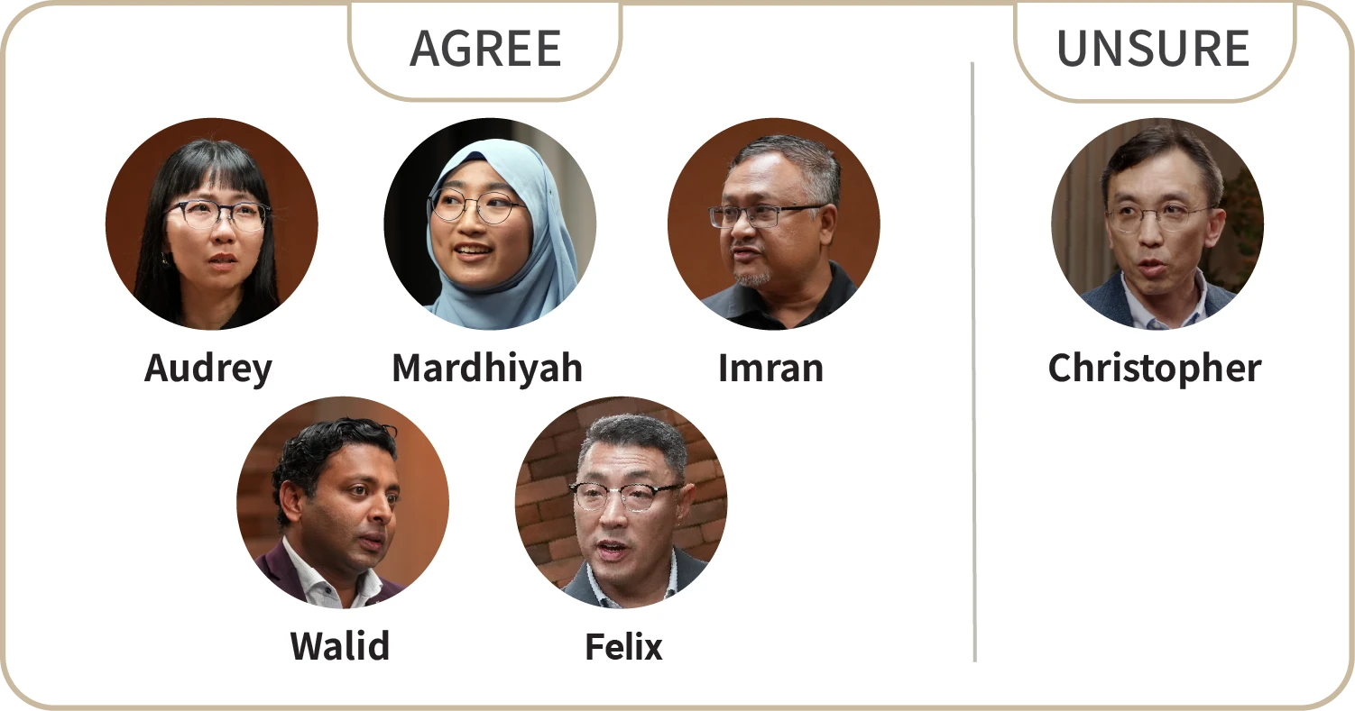 After some exchanged glances and nervous laughter, 20-year-old university student Nurainun Mardhiyah ventured to say she disagreed with the statement before changing her answer to “unsure”. Among the six participants at the dialogue, four chose to take this cautious position.