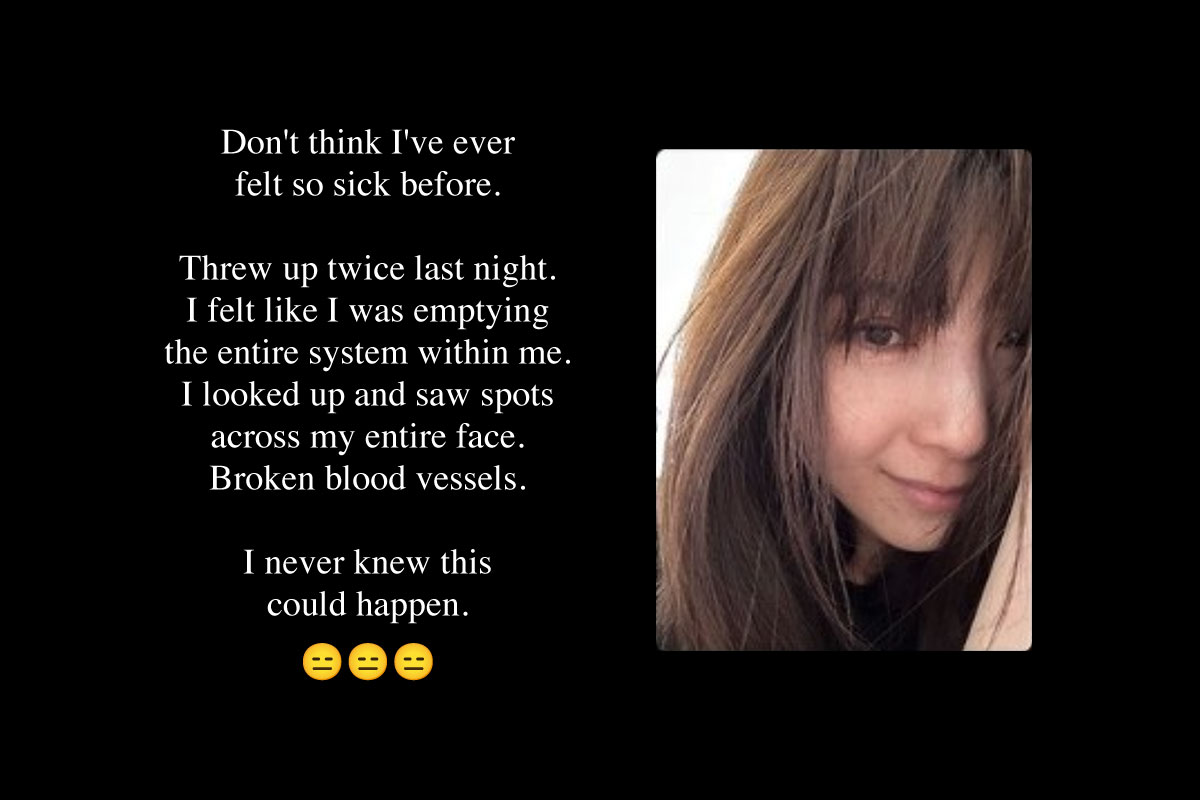 欧萱8月1日凌晨在IG限时动态留言:“从来没有这么难受过。昨晚吐了两次,呕吐的程度宛如清空身体内部。”她在狂吐之后,发现脸部因此血管爆裂,布满斑点。
