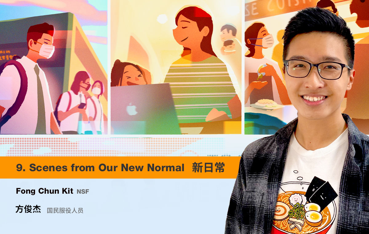 Taking the MRT to work in the morning, dining at a hawker centre, taking a stroll in a park... The seven simple and colourful illustrations depict the scenes of everyday life during the new normal. The creator hopes to spread positivity with the illustrations, and convey the message that as long as one stays optimistic, simple joys can be found in our daily life.