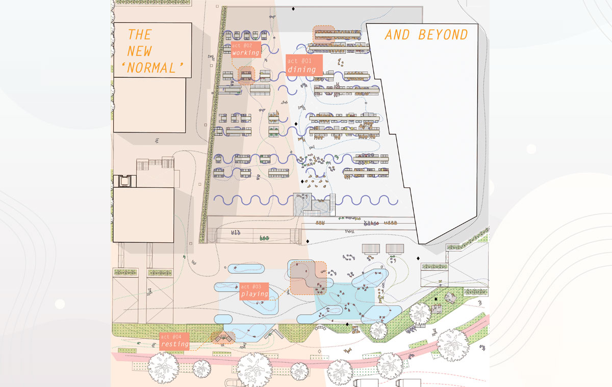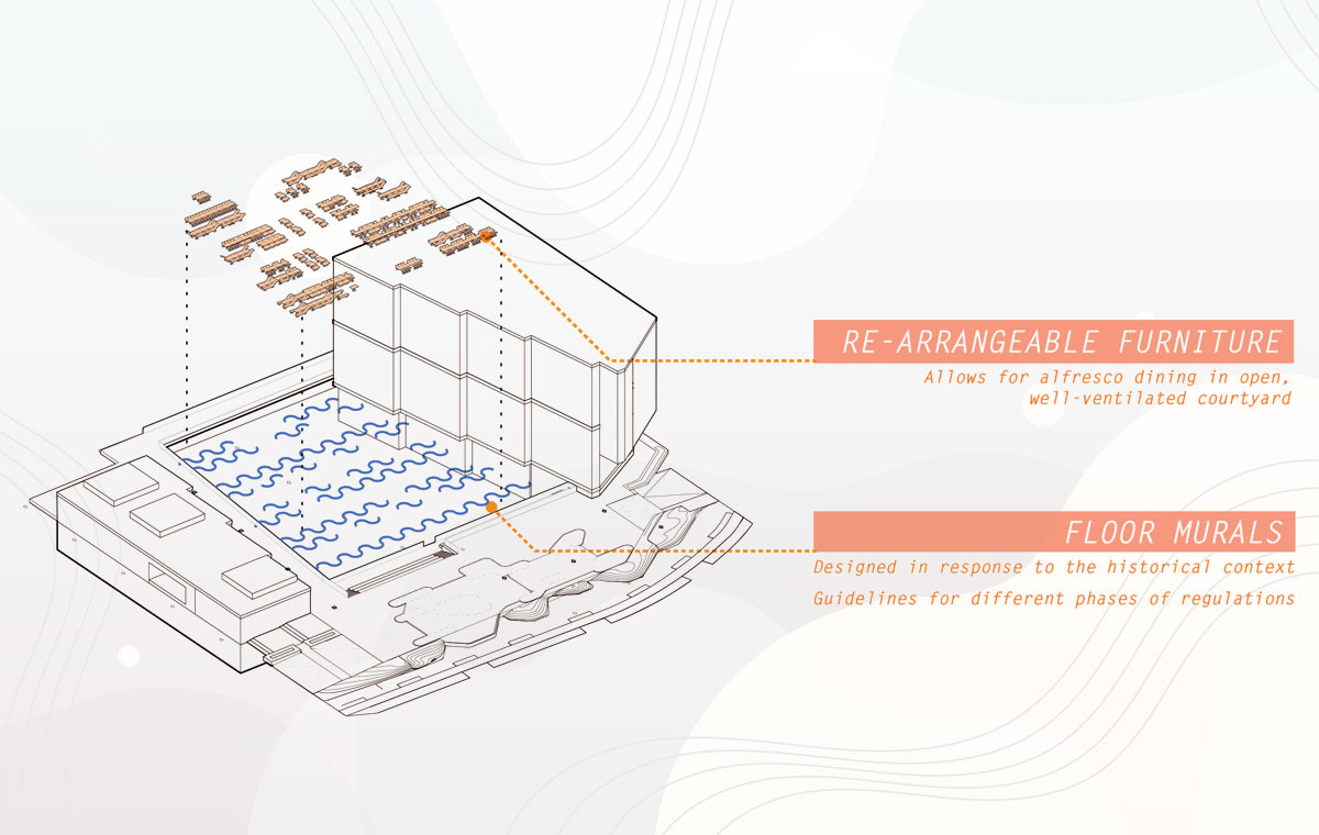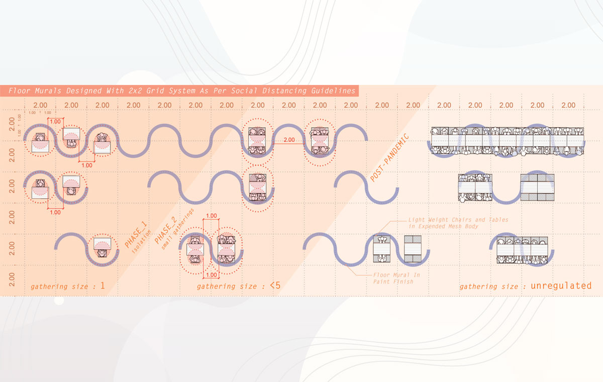 A semi-concentric floor mural design with a 2m by 2m grid system that helps people maintain a safe distance in a beautiful landscape. This simple design is easy to apply and can be replicated without much effort.