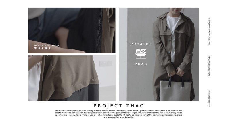 This modular garment design concept is birthed from the hate of cheap fast fashion and the desire for sustainable fashion and living. The design enables one to replace worn parts or exchange new parts to maintain the novelty of having a ‘new’ piece of clothing. One can expand the wardrobe indefinitely with permutations of different parts, coming together creatively into a piece of unique clothing. Thus, you can keep fashion sustainable, and still have new clothes. The Chinese character 肇 aspires to create a fresh perception of how we can use fashion to make a difference to our environment.