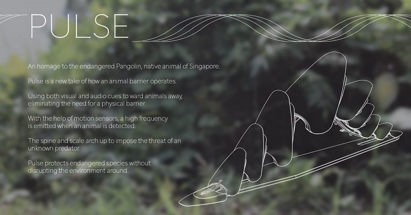 Paying homage to the endangered Pangolin, an animal native to Singapore, Pulse offers a new take on how an animal barrier operates. It uses both visual and audio cues to ward animals away, eliminating the need for a physical barrier. With the help of motion sensors, a high frequency is emitted when an animal is detected. The spine and scale arch up to detect the threat of an unknown predator. Pulse protects endangered species without disrupting the environment.
