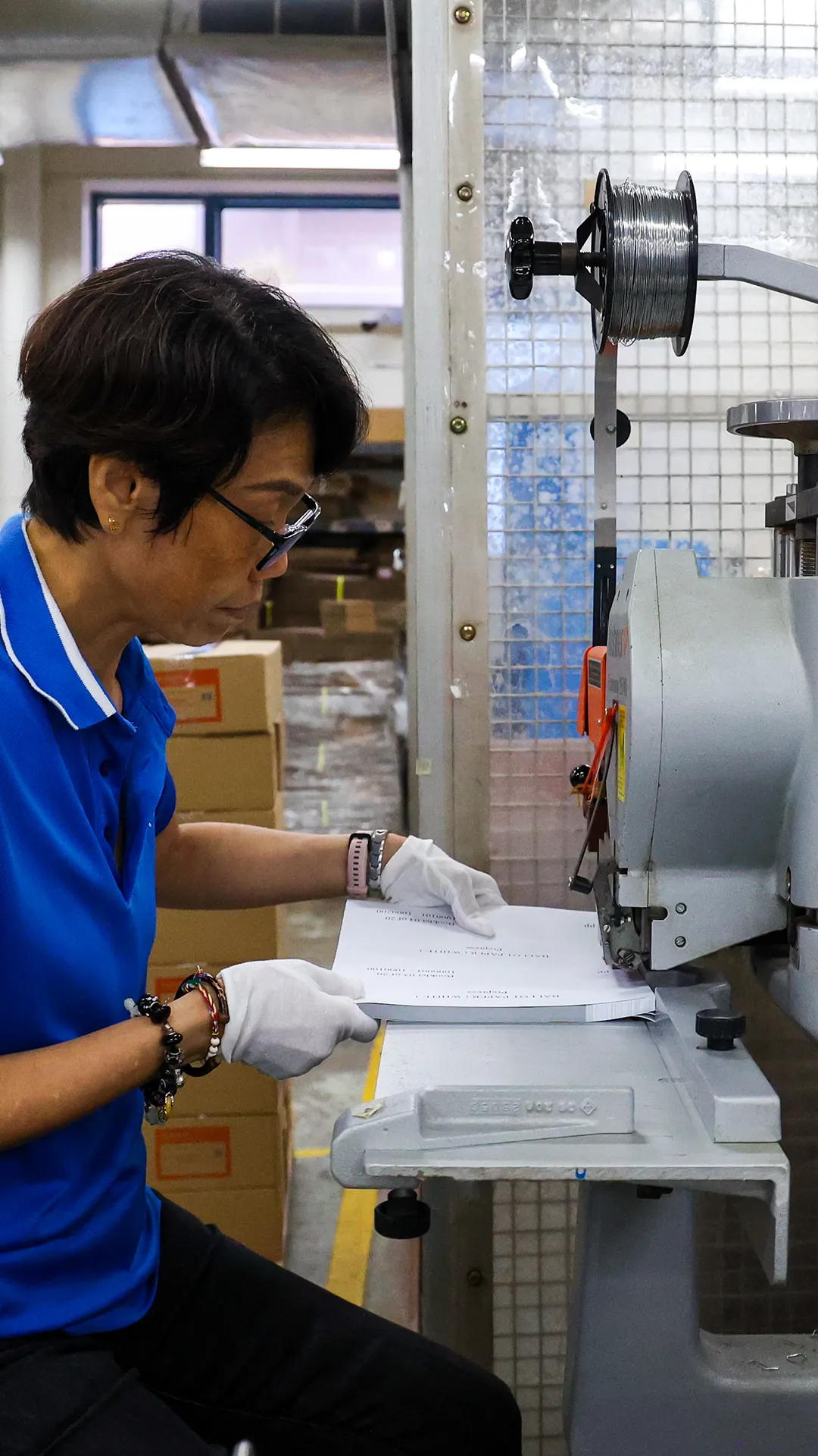 修边后的选票,需要装订成册,确保使用时整齐不散、方便携带。经验丰富的操作员每小时可装订约数百本选票册。