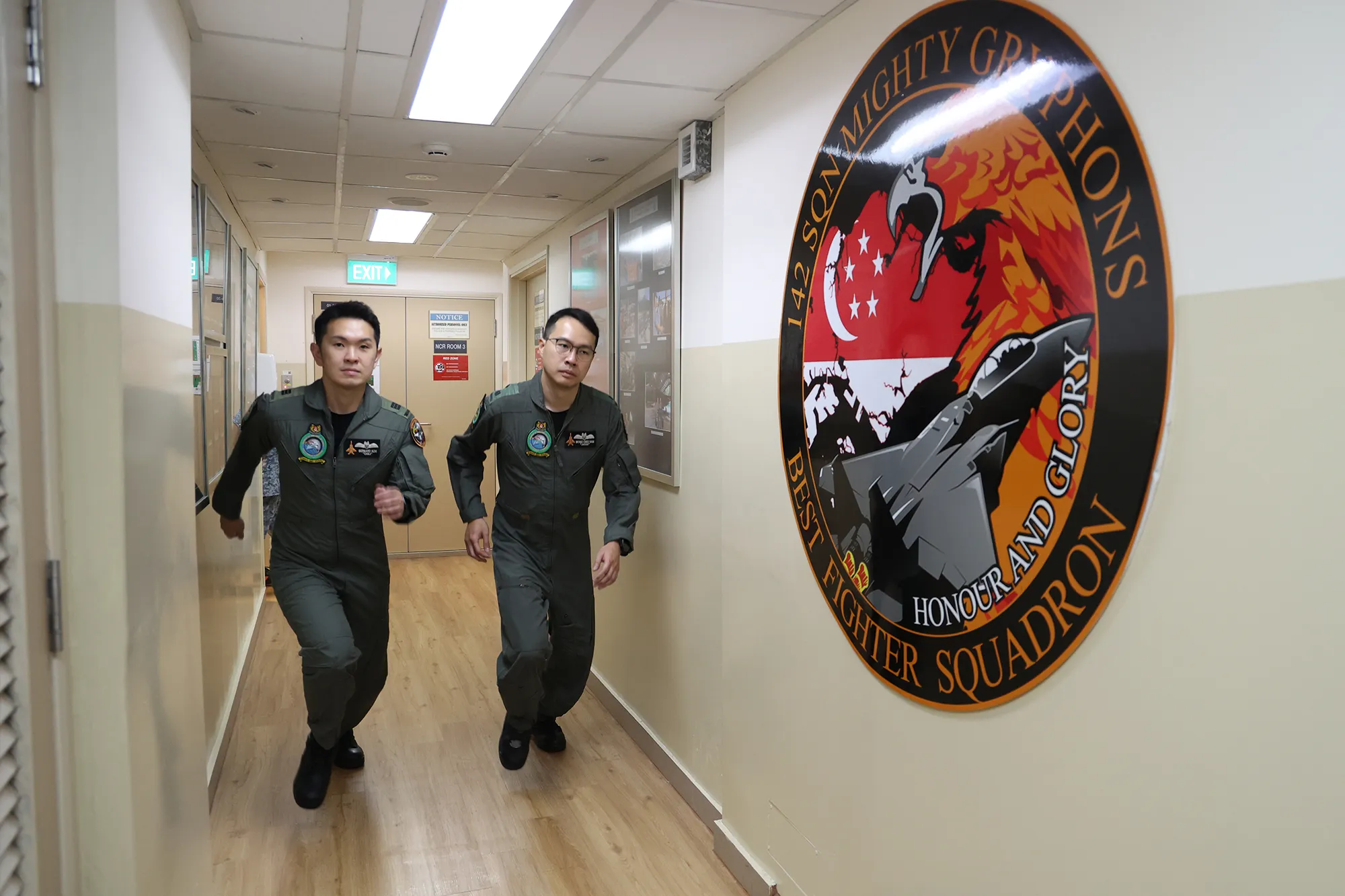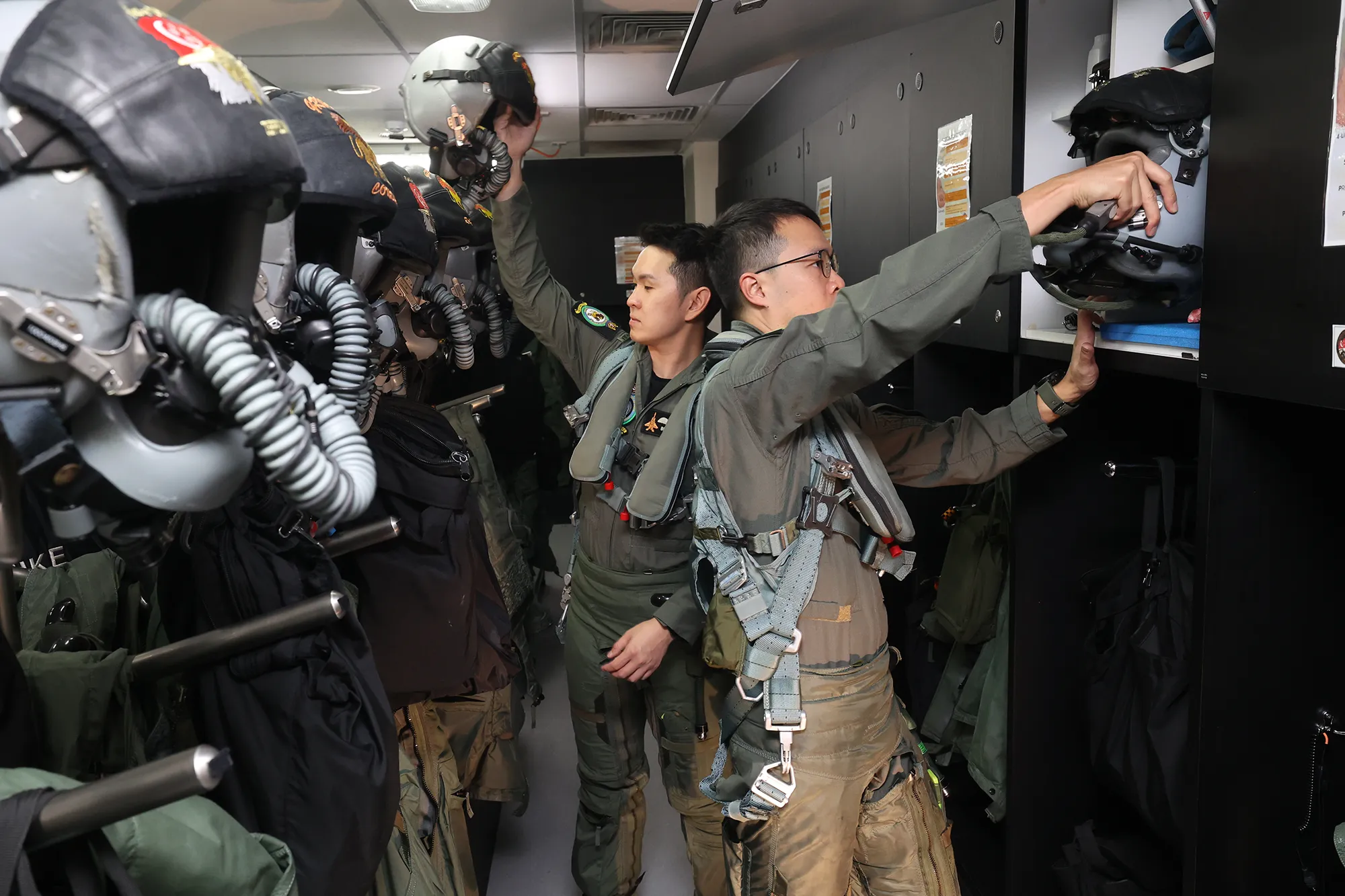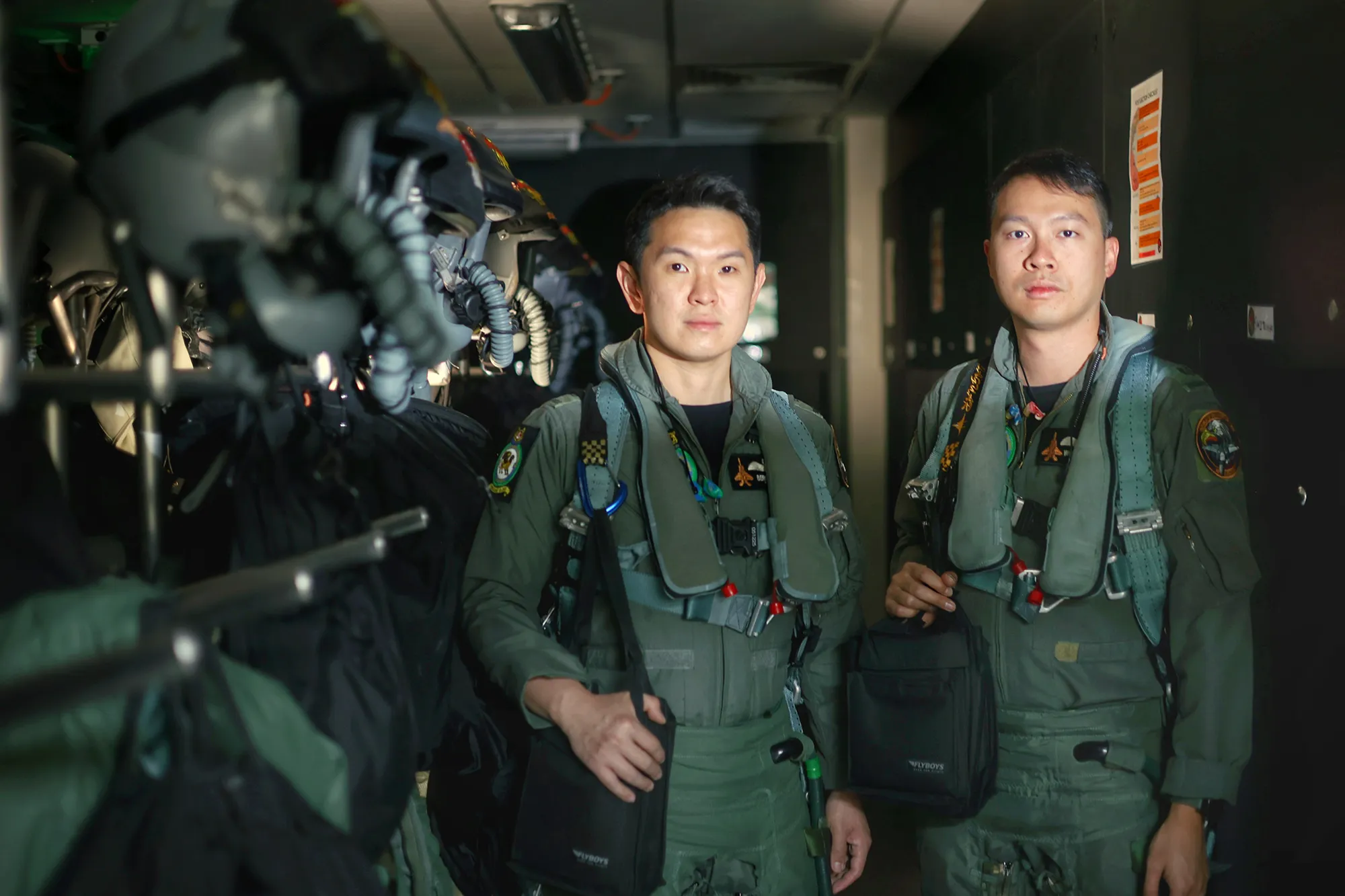 正在茶水间聊天的第142中队F-15SG型战斗机飞行员黄智瀚少校(37岁,右)与战斗机武器系统军官许钊维上尉(35岁,左),突然接获紧急起飞命令,两人立即放下手中的随行杯,迅速整装,向战机奔去。