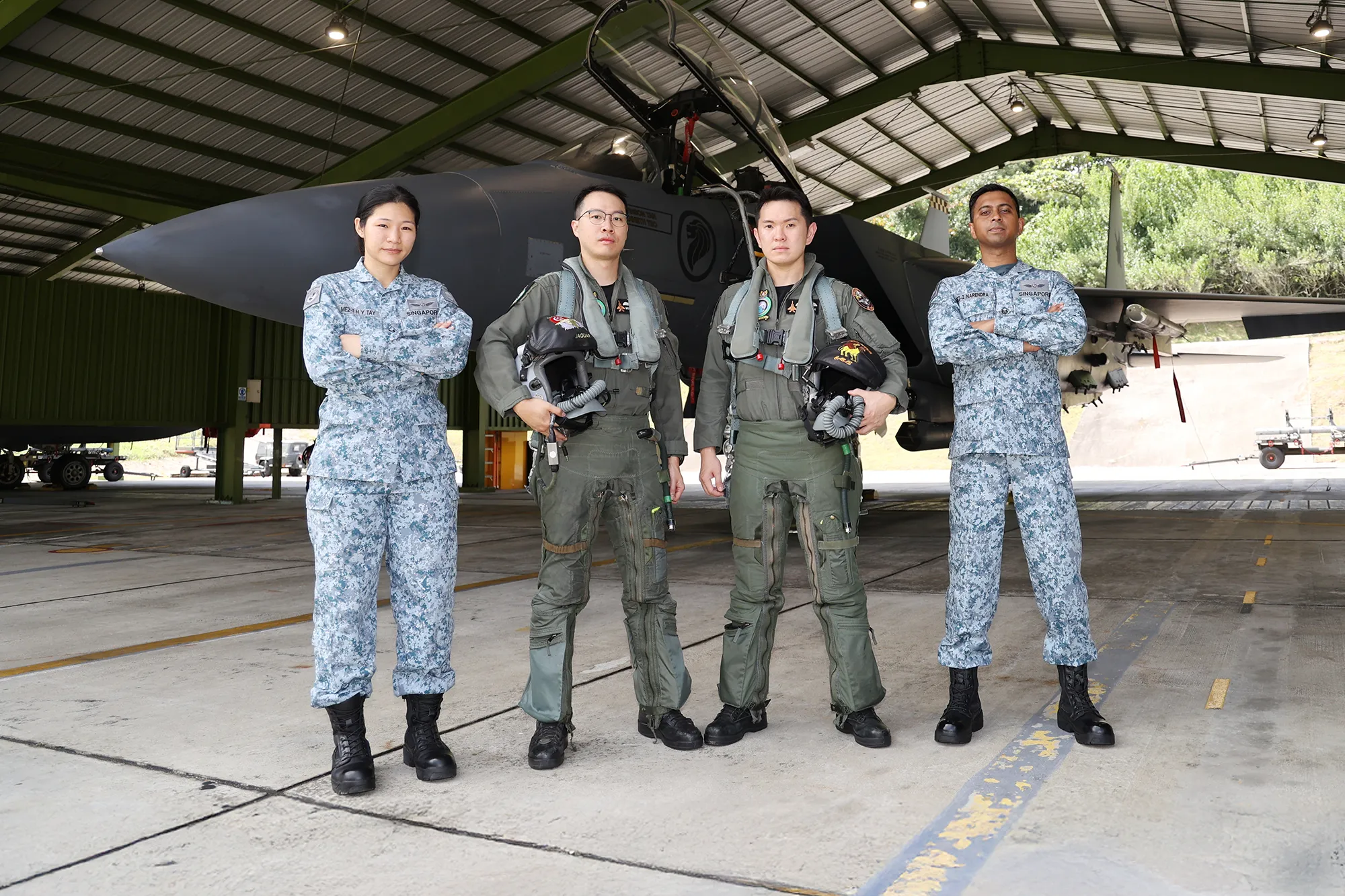 左起: 郑慧愈(空军维修工程师二级军事专才), 黄智瀚少校(第142中队F-15SG型战斗机飞行员), 许钊维上尉(战斗机武器系统军官), 纳伦德拉古玛(Narendrakumar,二级军事专才)